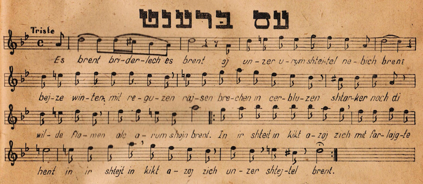 Es brent! briderlach, es brent!Es ken chalile kumen der moment!Dos ganze schtetl mit ajch zusamenwet awek mit esch un flamen.Farblajben wein wi noch a shrejfeowei schwarze puste went!Schtajt nit brider kukt asoj sichmit farlajgte hent!Schtajt nit brider kukt asoj sich,Wi unser schtetl brent!