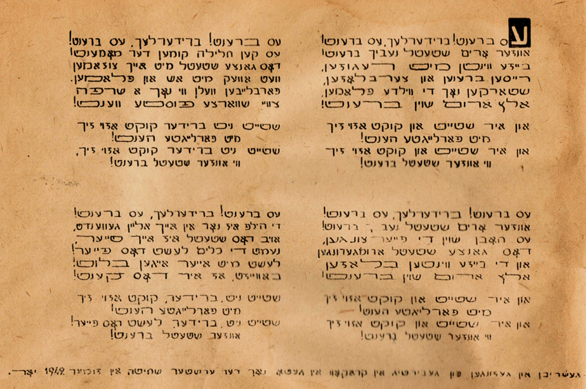 Geschriben un gesungen fun Gebirtig in Krakow in geto noch der erschter schchite in somer 1942 jor.(Der kompozitor iz Mordekhay Gebirtig)